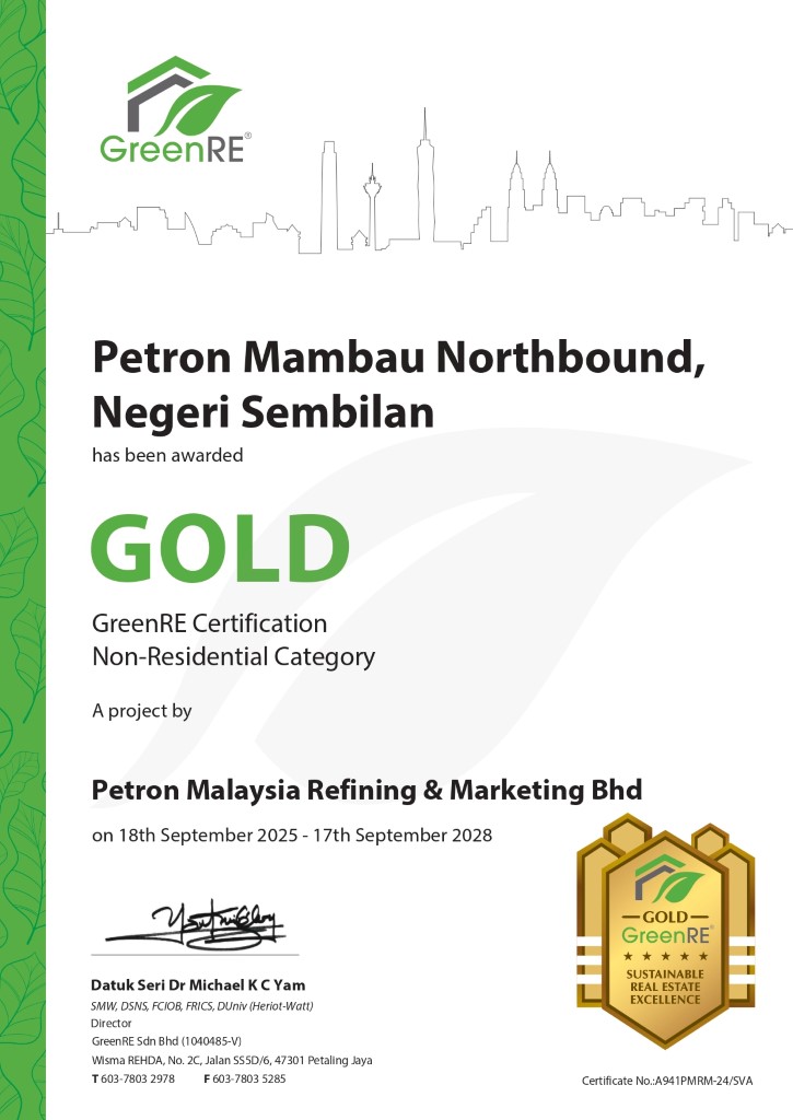 “We are pleased to award GreenRE Gold certification to Petron Mambau Northbound, a facility that demonstrates how service stations can be designed to operate more sustainably. From