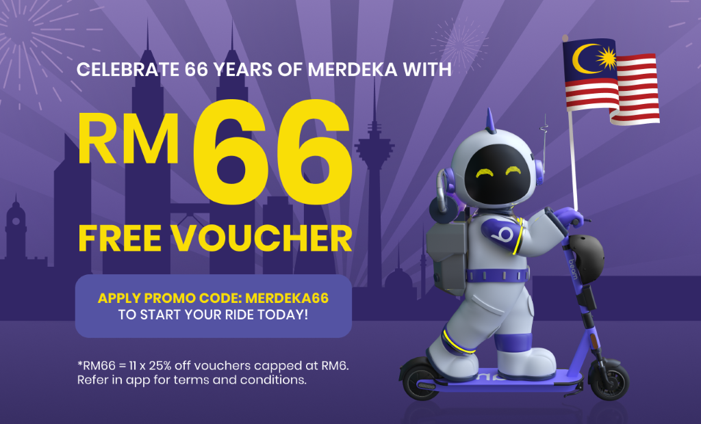 KUALA LUMPUR: To commemorate Malaysia's 66th Merdeka anniversary, Beam Mobility is offering residents of Kuala Lumpur and Selangor ride vouchers worth RM66 for free.