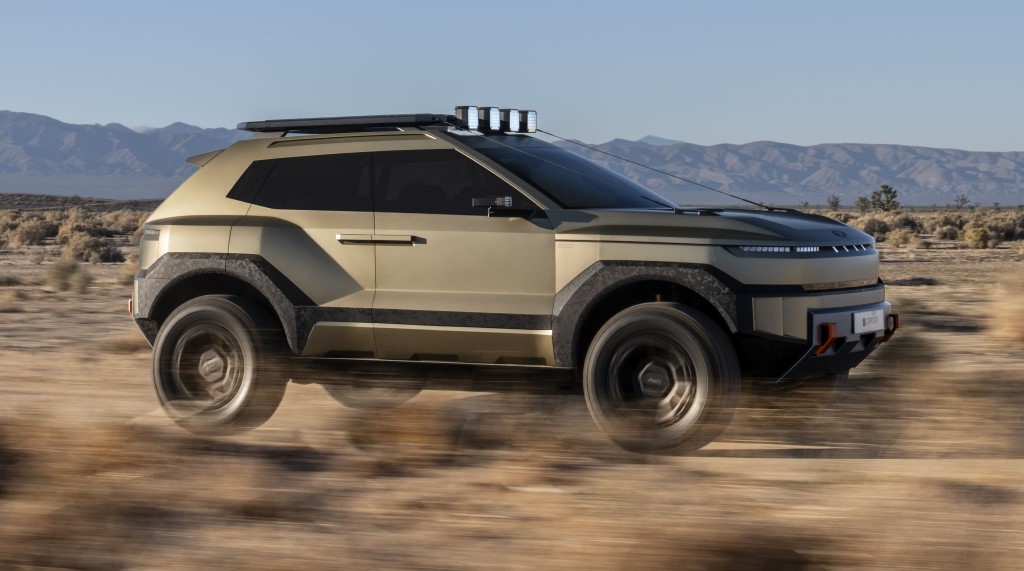 A wide, functional skid plate stretches across Crater concept’s underbody, not only for added protection, but to visually anchor the vehicle.