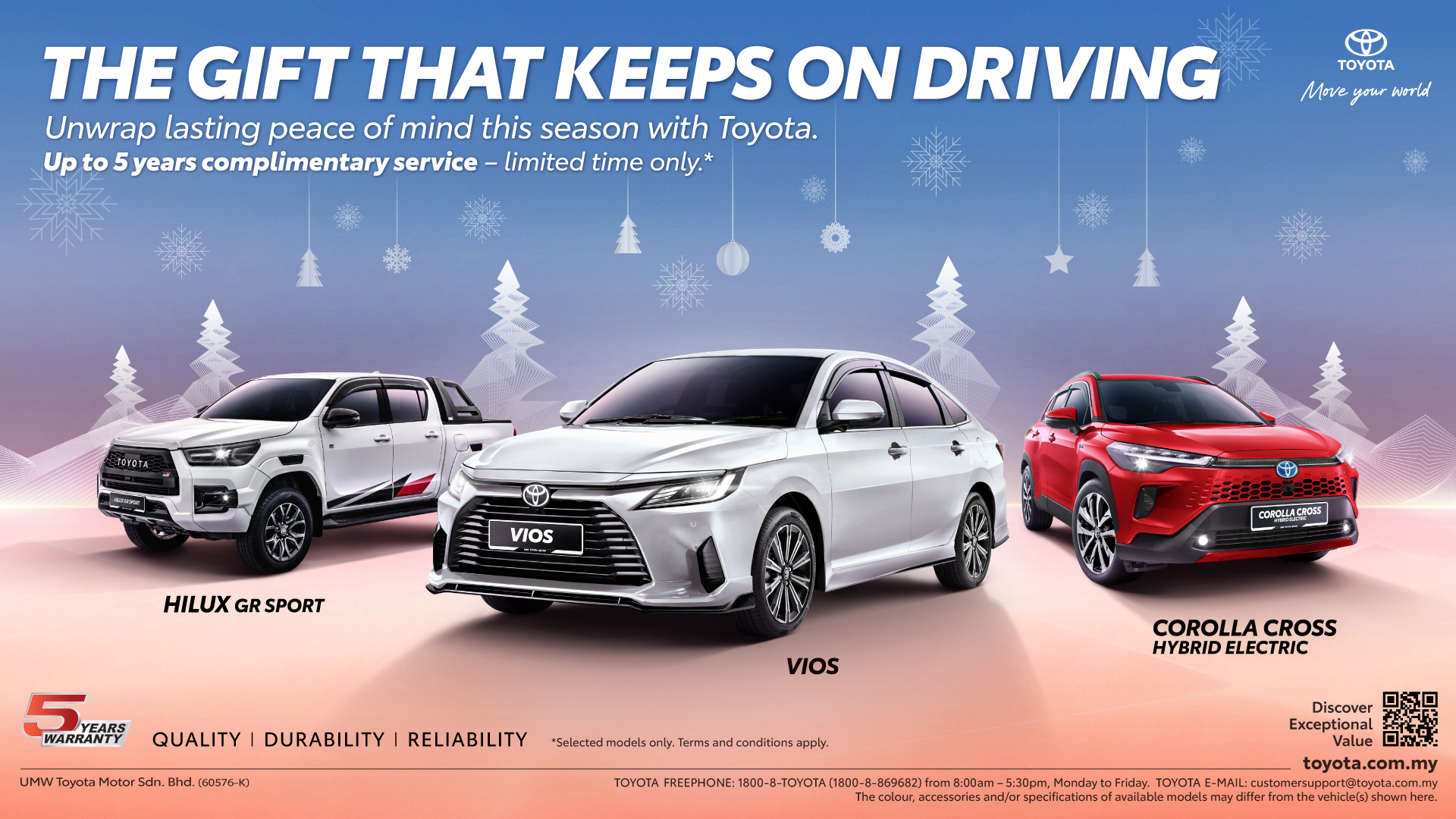 Unwrap lasting peace of mind this season with Toyota and up to five years complimentary service for a limited time only for selected models.