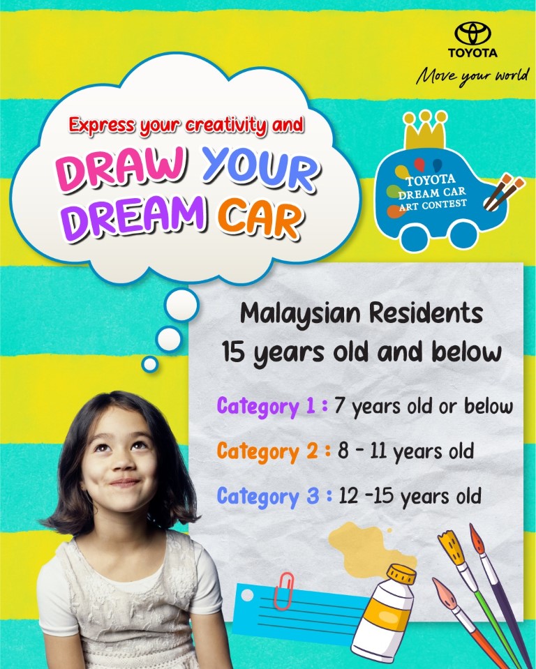 The 19th Toyota Dream Car Art Contest will run in Malaysia from Oct 1, 2025 to Feb 8, 2026 with the theme “Your Dream Car” and is open to three age categories: